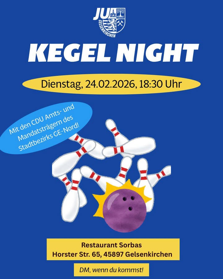 mehr🎳 Es ist wieder soweit! Die JU Gelsenkirchen lädt zur KEGEL NIGHT ein! 🗓️ Dienstag, 24. Februar 2026 🕡 18:30 Uhr 📍 Restaurant Sorbas, Horster Str. 65, 45897 GE 🤝 Triff die CDU Amts- und Mandatsträger des Stadtbezirks GE-Nord! Wir freuen uns auf gute Gespräche und gute Würfe. 💬 DM, wenn du kommst!