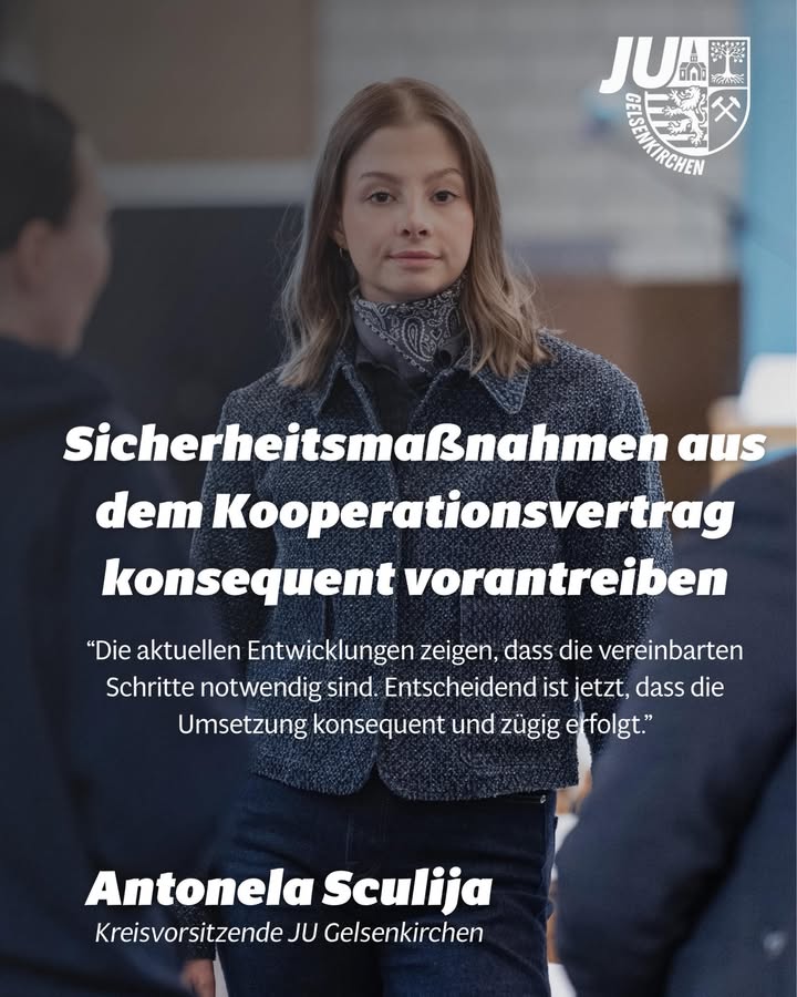 mehr📣 Statement der Jungen Union GelsenkirchenDie neue Kriminalstatistik für Gelsenkirchen zeigt ein gemischtes Bild: Insgesamt weniger Straftaten, zugleich ein deutlicher Anstieg schwerer Gewaltdelikte. 21 Tötungsdelikte statt sechs im Vorjahr und ein Plus von 16,6% bei Raub im öffentlichen Raum zeigen klaren Handlungsbedarf. Im Kooperationsvertrag wurde der Ausbau der Videoüberwachung sowie der erweiterte Einsatz KI-gestützter Systeme an sensiblen Orten vereinbart. "Die aktuellen Entwicklungen zeigen, dass die vereinbarten Schritte notwendig sind. Entscheidend ist jetzt, dass die Umsetzung konsequent und zügig erfolgt.", erklärt Antonela Sculija, Kreisvorsitzende der Jungen Union Gelsenkirchen.