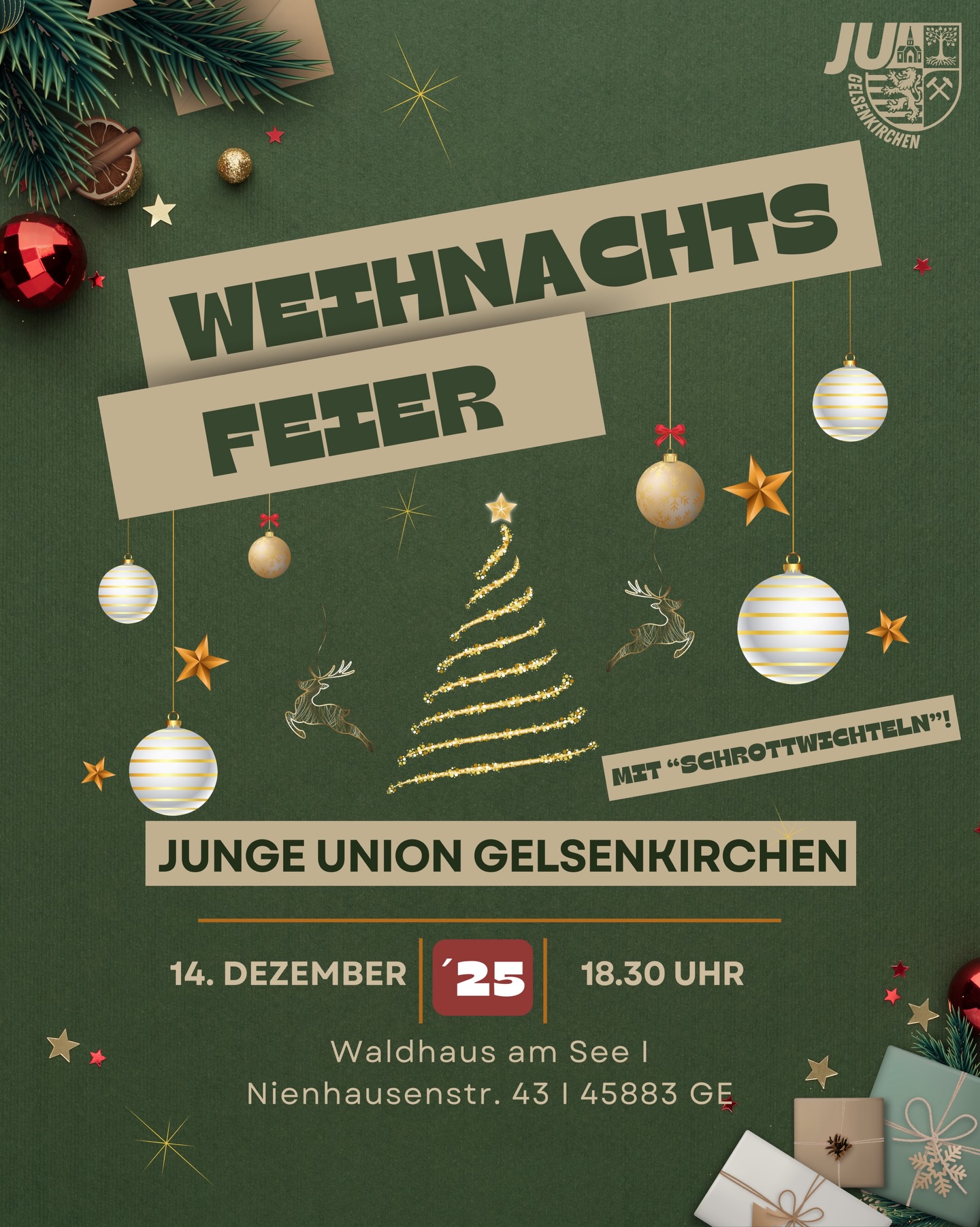 mehr🎄✨ WEIHNACHTSFEIER DER JUNGEN UNION GELSENKIRCHEN ✨🎄 Es wird festlich ? und ein bisschen schrottig 😉 Am 14. Dezember treffen wir uns zur Weihnachtsfeier der JU Gelsenkirchen. Mit Schrottwichteln, guter Stimmung und allem, was dazugehört. 📍 Waldhaus am See 🕡 18:30 Uhr Packt eure schlimmsten Geschenke ein und bringt gute Laune mit ? wir freuen uns auf euch! 🎁😄 #Weihnachtsfeier #JUGelsenkirchen #JungeUnion