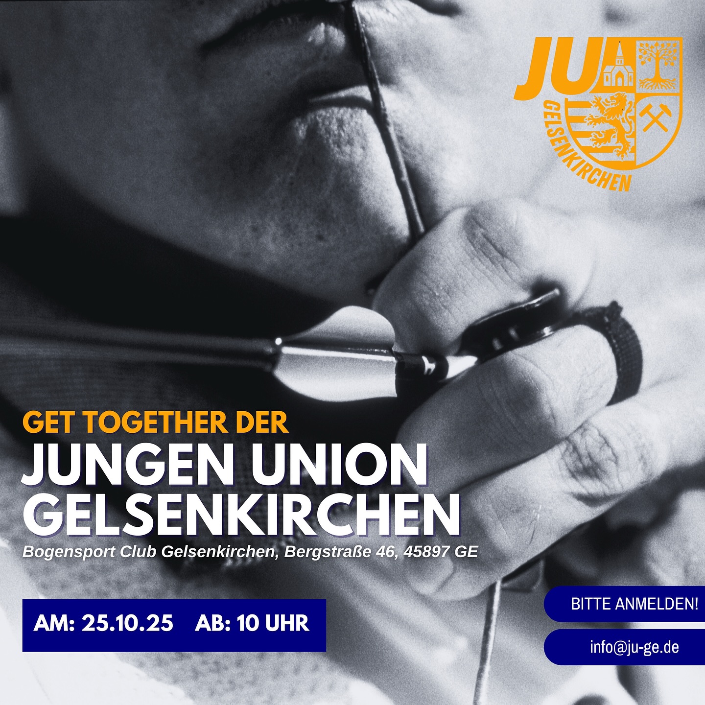 mehr🎯 Ziel anvisieren ? Gemeinschaft stärken! Am 25. Oktober 2025 ab 10 Uhr treffen wir uns zum Get Together der Jungen Union Gelsenkirchen im Bogensport Club Gelsenkirchen 🏹 DIE VERANSTALTUNG FINDET NUR BEI GUTEM WETTER STATT!! 🌤️☀️ Erlebt einen spannenden Tag voller Teamgeist, Austausch und Action. Für Verpflegung und gute Laune ist gesorgt! 😄 📍 Ort: Bogensport Club Gelsenkirchen, Bergstraße 46, 45897 GE 📅 Datum: 25.10.25 🕙 Start: 10 Uhr 👉 Bitte anmelden: info@ju-ge.de #JungeUnion #Gelsenkirchen #GetTogether #JUEvents #Teamgeist #Bogensport #GemeinsamStark #JUGelsenkirchen