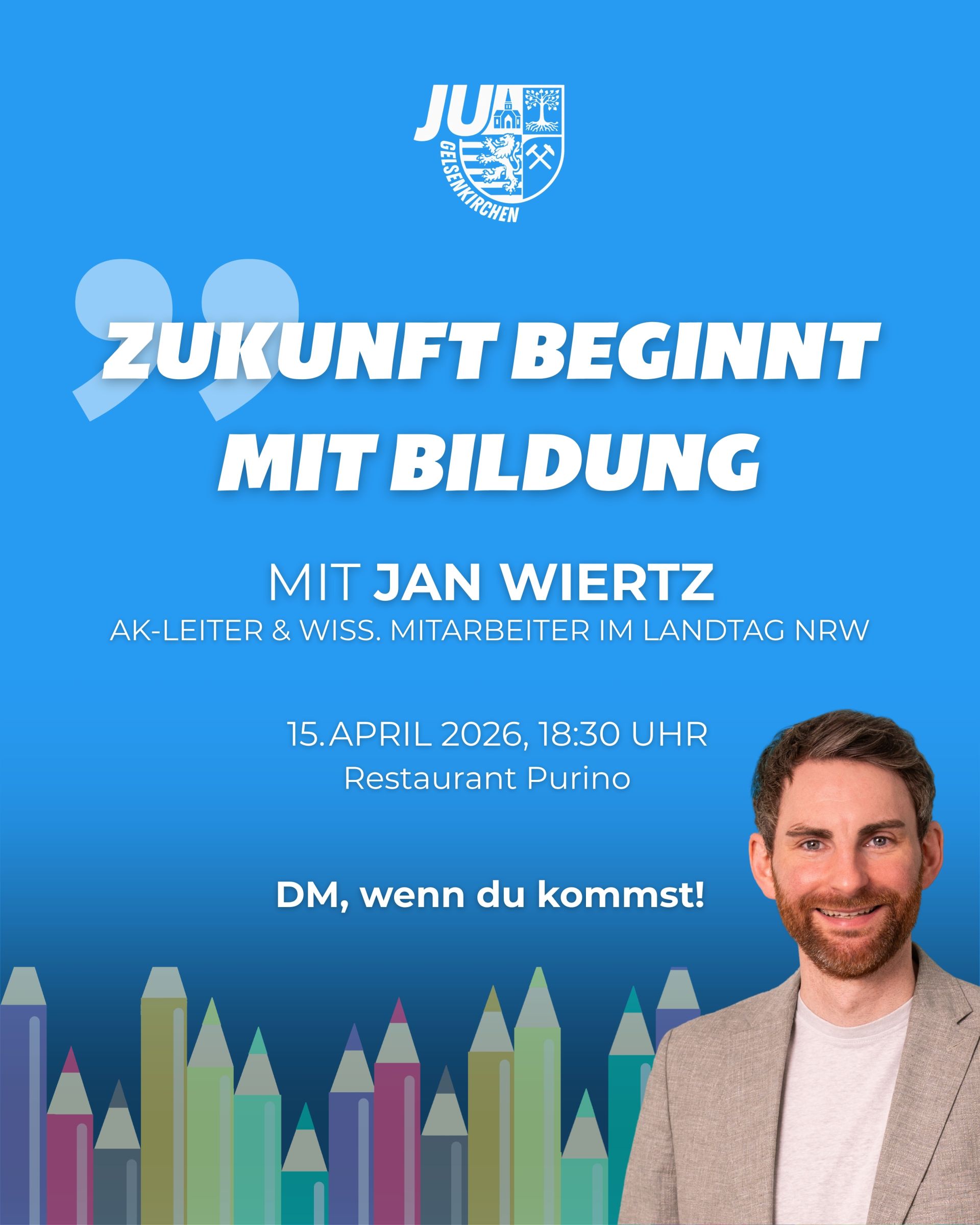 Als Gast erwarten wir den Arbeitskreis-Leiter der JU NRW, Jan Wiertz. Er wird Einblicke in die bildungspolitischen Debatten auf Landesebene geben und erläutern, welche Herausforderungen und Chancen besonders in der frühkindlichen Förderung liegen.